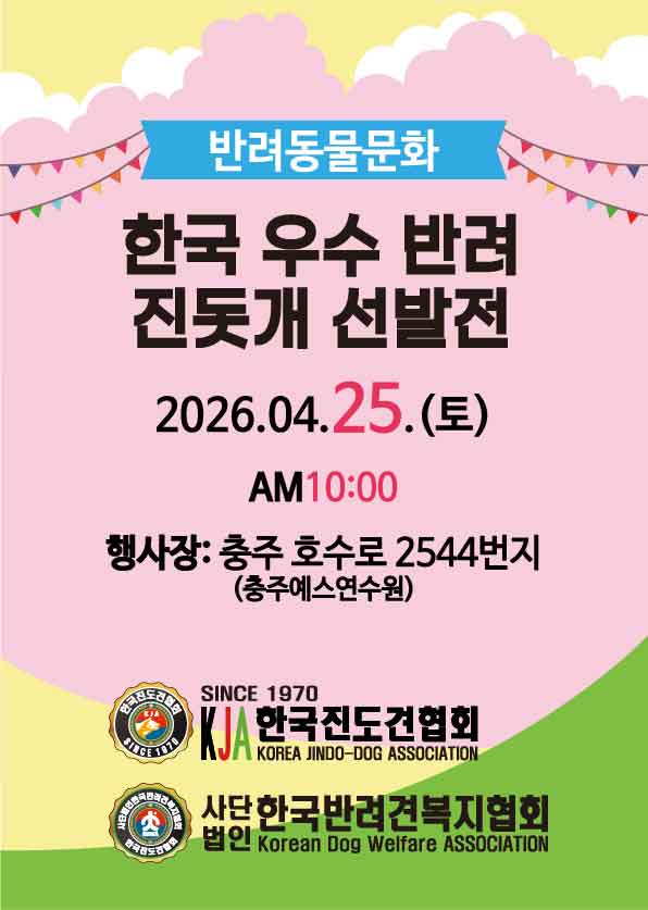 ● 내 용 : 55년의 역사와 빛나는 전통을 잇는 한국진도견협회가 중앙정부로부터 사단법인 한국반려견복지협회 인 공익 법인을 취득하였습니다 따라서 한국진도견협회는 대한민국 원조 진돗개전문단체 로서 2026.03.03일부로 유능한 행정직.등 상근직 임원 4명을 충원하였음으로 한국진도견발전은 물론,국견 육성에 크나큰 밝은 미래가 올것입니다 동참하실 회원은 사무국으로 연락주세요 (02)966-4646 / 010-9042-2266 2026.03.04